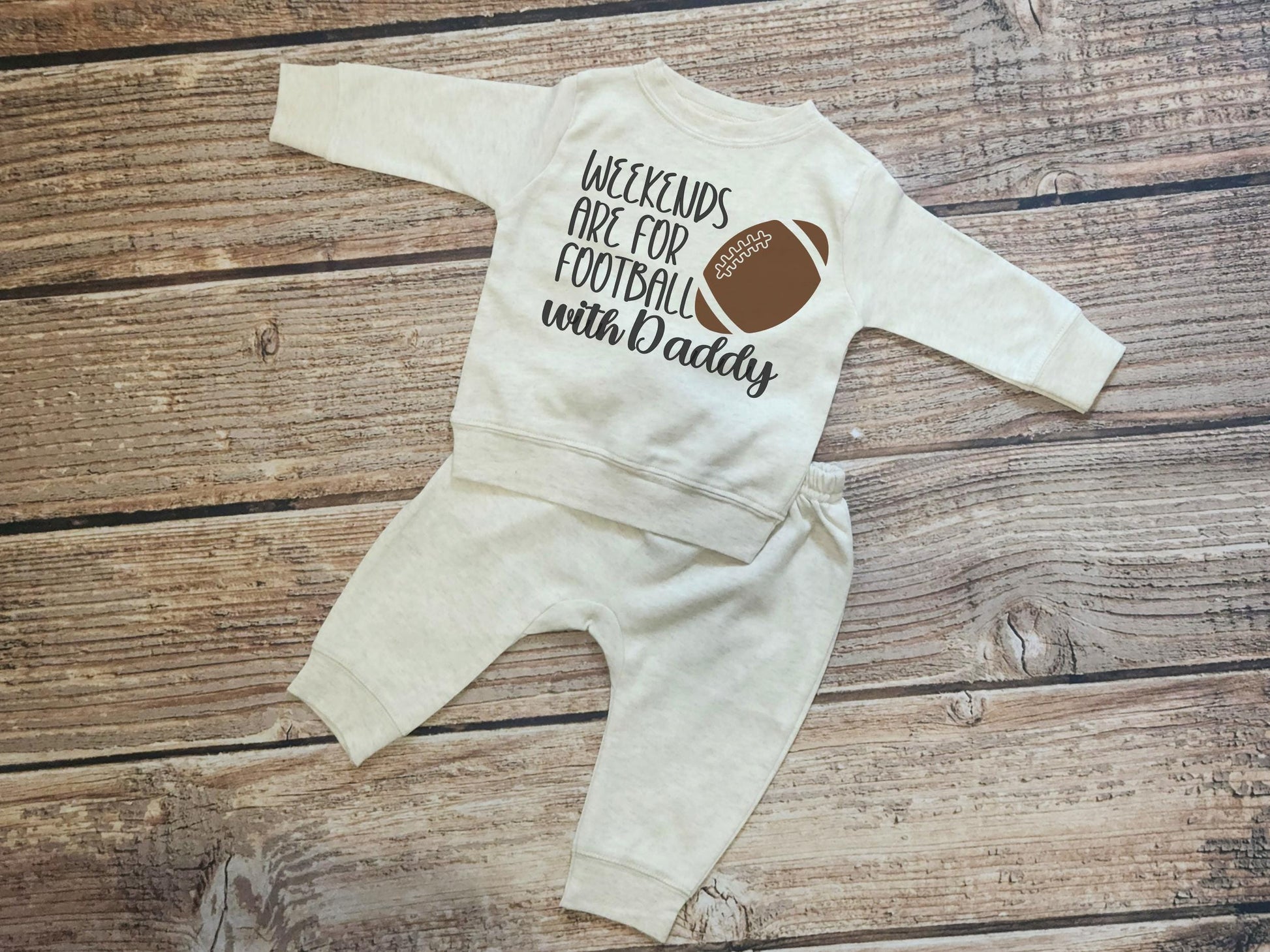 These adorable weekends are for football with daddy jogger sets are the perfect game day spirit shirt for little sports fans. These oversized jogger sets are made with 65% Polyester, 35% Cotton jersey and are super soft and lightweight - perfect for fall nights during football season.