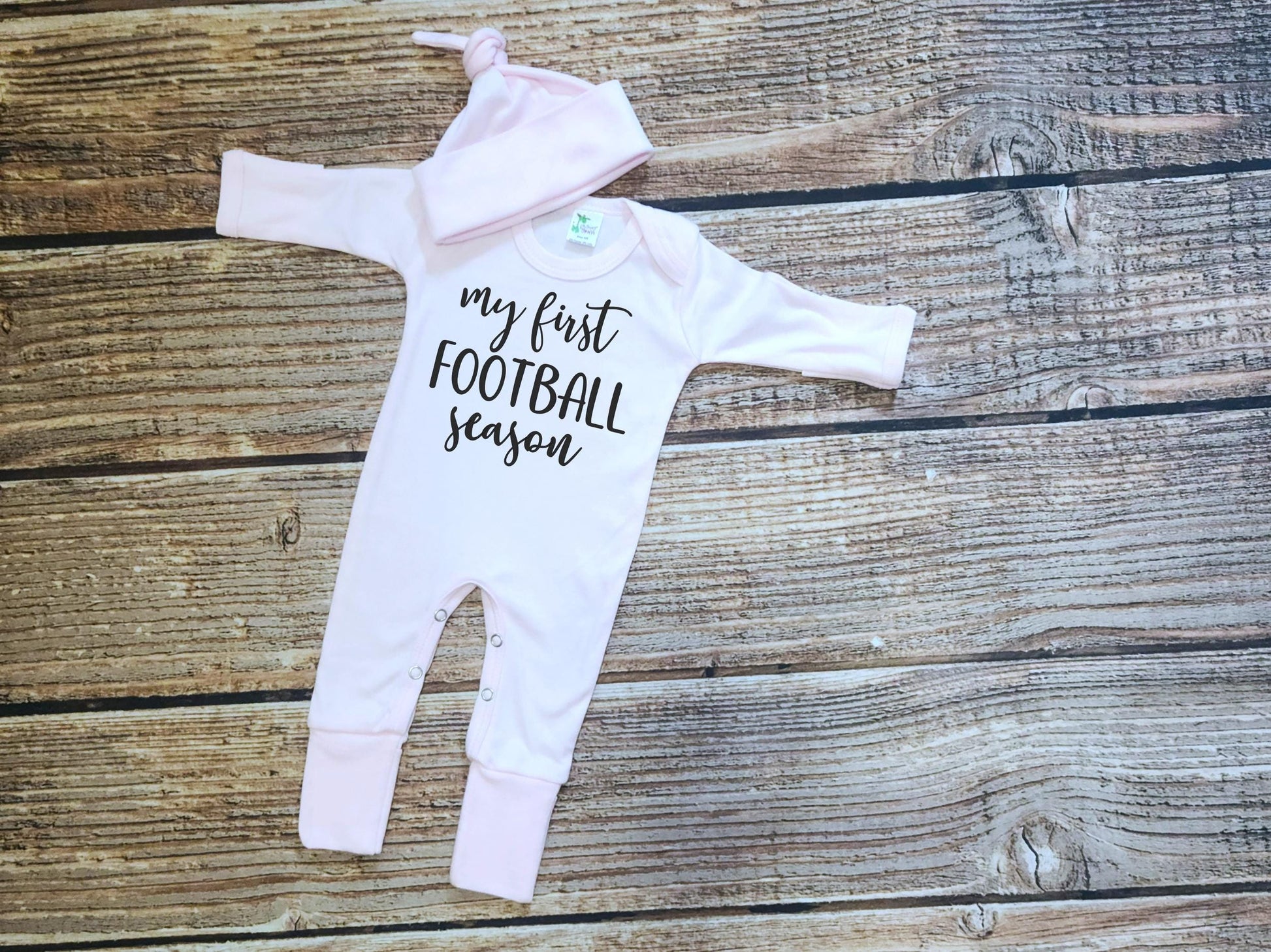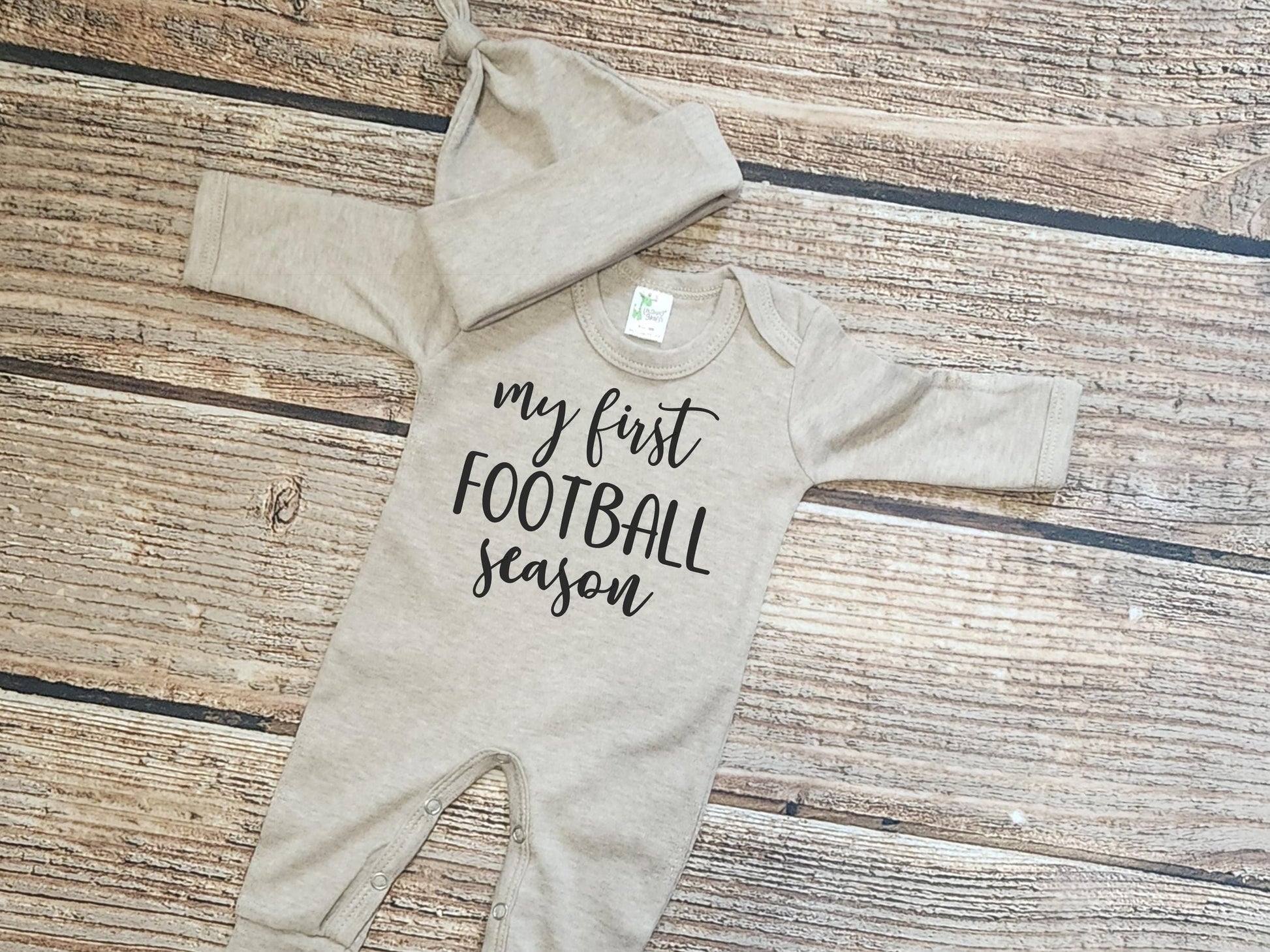 This my first football season outfit is the perfect game day spirit shirt for your newest sports fan or as a football-themed baby announcement bodysuit. These adorable sleeper and hat sets are made with 65% Polyester, 35% Cotton jersey and are super soft and lightweight - perfect newborn football outfits for baby.