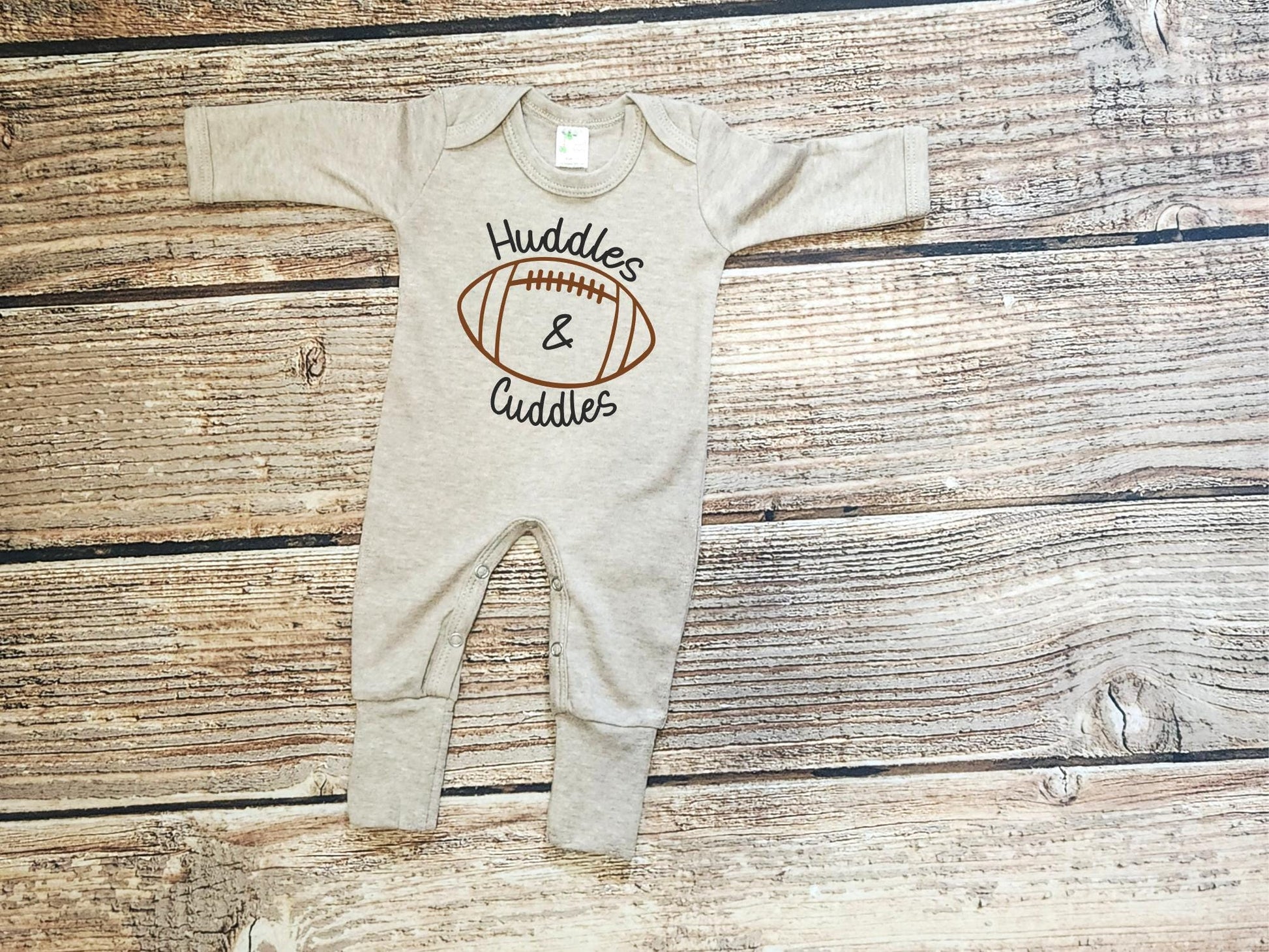This adorable football romper set is the perfect game day spirit shirt for your newest sports fan or as a football-themed baby announcement. These adorable newborn sleeper sets are made with 65% Polyester, 35% Cotton jersey and are super soft and lightweight - perfect newborn football outfits for baby.