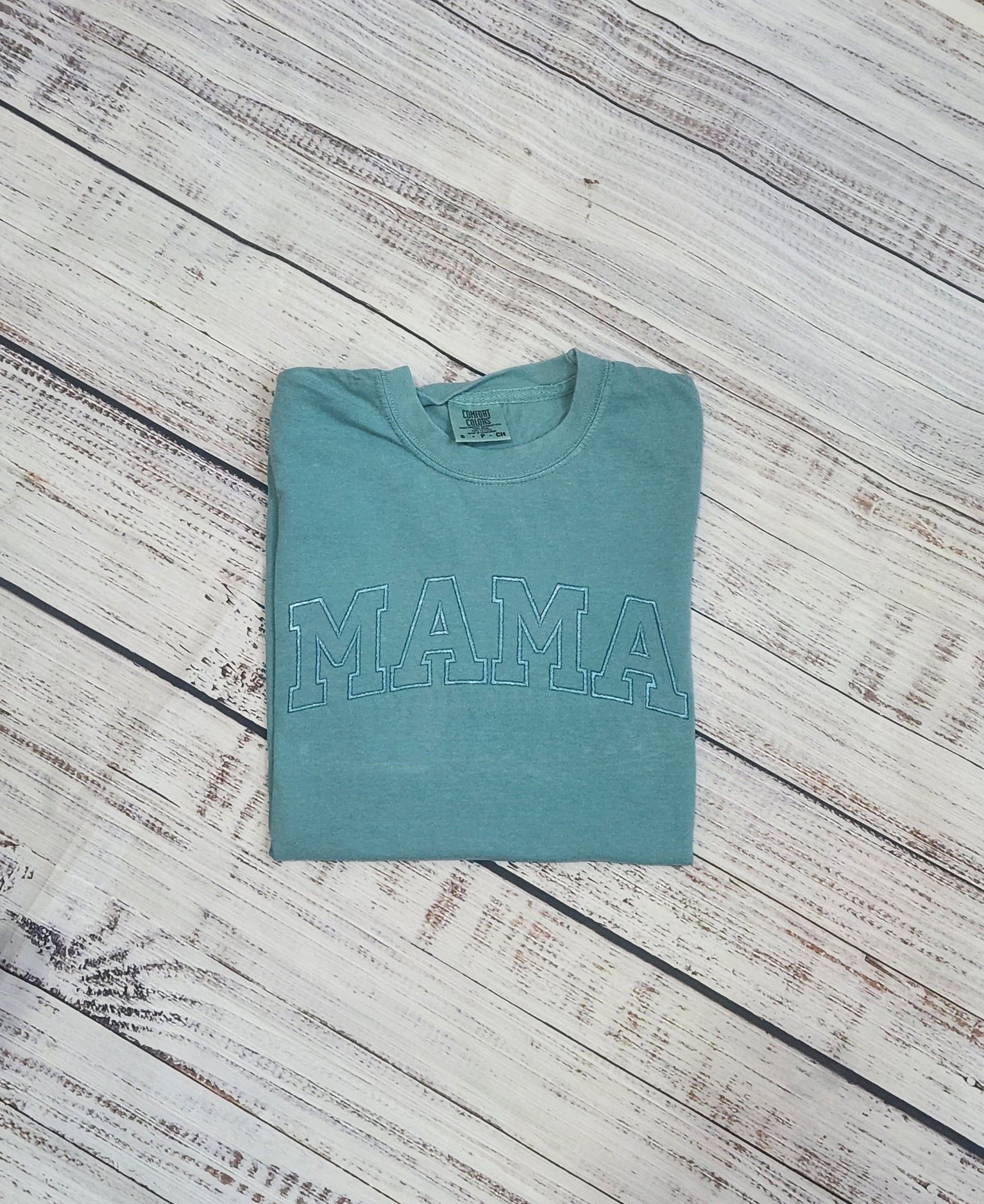 This comfort colors shirt features an arched varsity font "MAMA" embroidered with tone on tone embroidery thread.