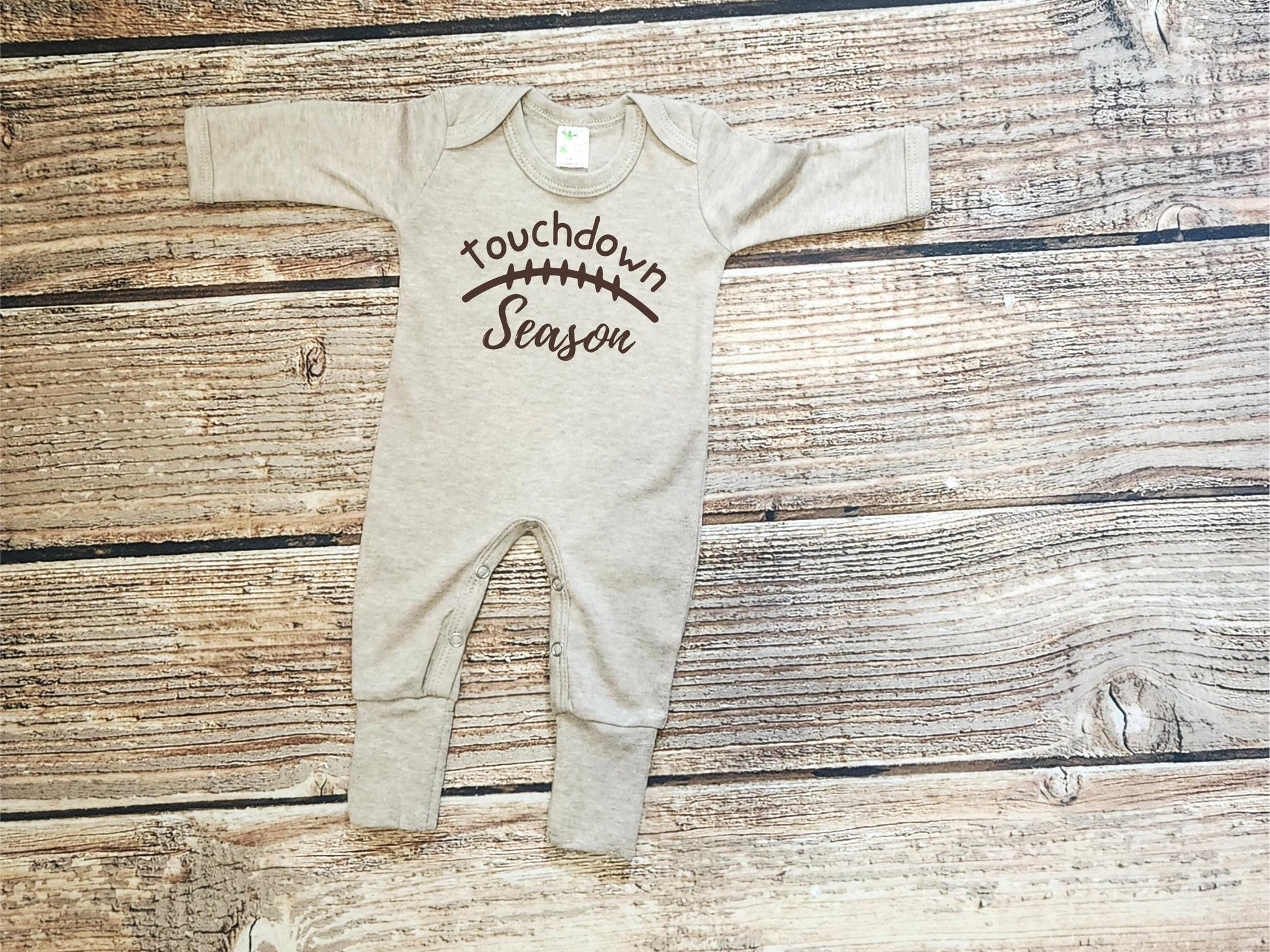 This touchdown season outfit is the perfect game day spirit shirt for your newest sports fan or as a football-themed baby announcement bodysuit. These adorable sleeper and hat sets are made with 65% Polyester, 35% Cotton jersey and are super soft and lightweight - perfect newborn football outfits for baby.